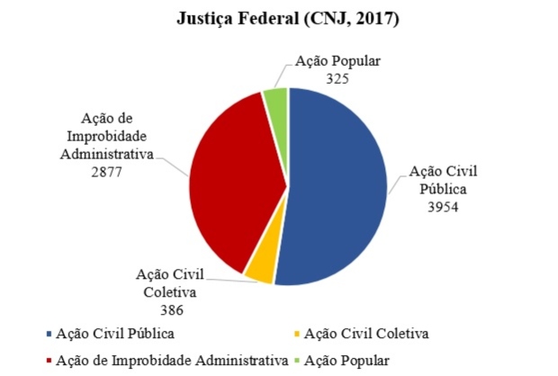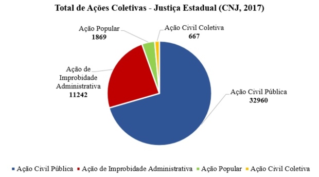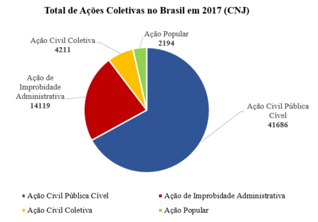 Apenas em 2017, ingressaram no Judiciário 62.210 ações coletivas[8], sendo 41.686 ações civis públicas, 14.119 ações de improbidades administrativa, 4.211 ações civis coletivas e 2.194 ações populares.