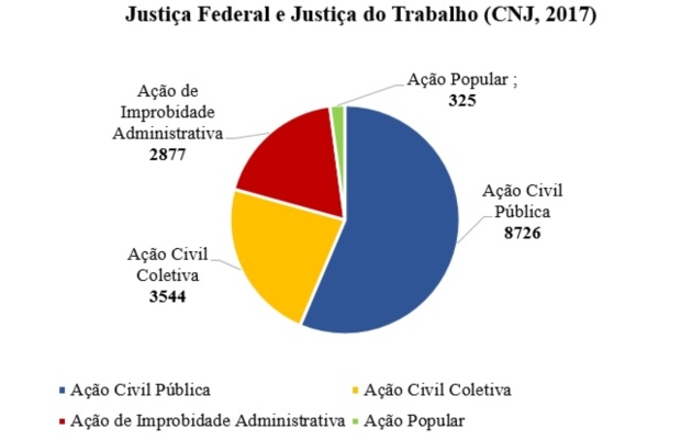 Já na Justiça Federal e Justiça do Trabalho, ingressaram, em 2017, 8.726 ações civis públicas, 2.877 ações de improbidade administrativa, 3.544 ações civis coletivas e 325 ações populares. Desse conjunto numérico, 4.772 ações civis públicas e 3.158 ações civis coletivas nos TRTs e 3.954 ações civis públicas, 2.877 ações de improbidade administrativa, 386 ações civis coletivas e 325 ações populares dos TRFs[10].