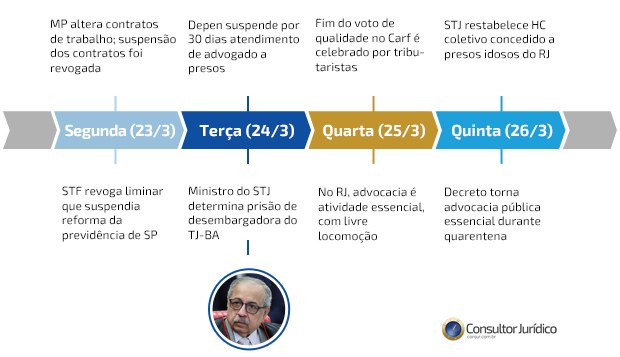 Assim como na semana anterior, as decisões judiciais e administrativas motivadas pela Covid-19 dominaram o noticiário. No dia 19, o Conselho Nacional de Justiça baixou resolução determinando um plantão extraordinário nos tribunais e a suspensão dos prazos até o dia 30 de abril.