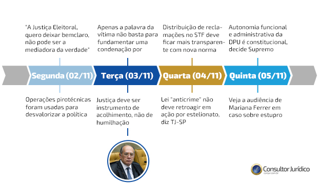 "As cenas da audiência de Mariana Ferrer são estarrecedoras. O sistema de Justiça deve ser instrumento de acolhimento, jamais de tortura e humilhação. Os órgãos de correição devem apurar a responsabilidade dos agentes envolvidos, inclusive daqueles que se omitiram", ministro Gilmar Mendes ao comentar as imagens divulgados do julgamento do caso Mariana Ferrer.