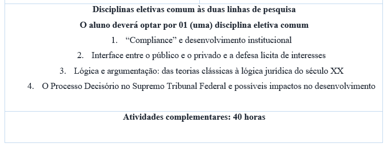 A estrutura curricular foi idealizada, especialmente, para profissionais que atuam junto aos departamentos jurídicos de empresas. As disciplinas, os trabalhos e a dissertação exigidos no curso dirão respeito a problemas jurídicos e econômicos e seus reflexos na empresa e na sociedade; contribuindo: (i) ao aprimoramento da atividade profissional do(a) mestrando(a); e (2) ao desenvolvimento sócio-econômico-cultural do Brasil.