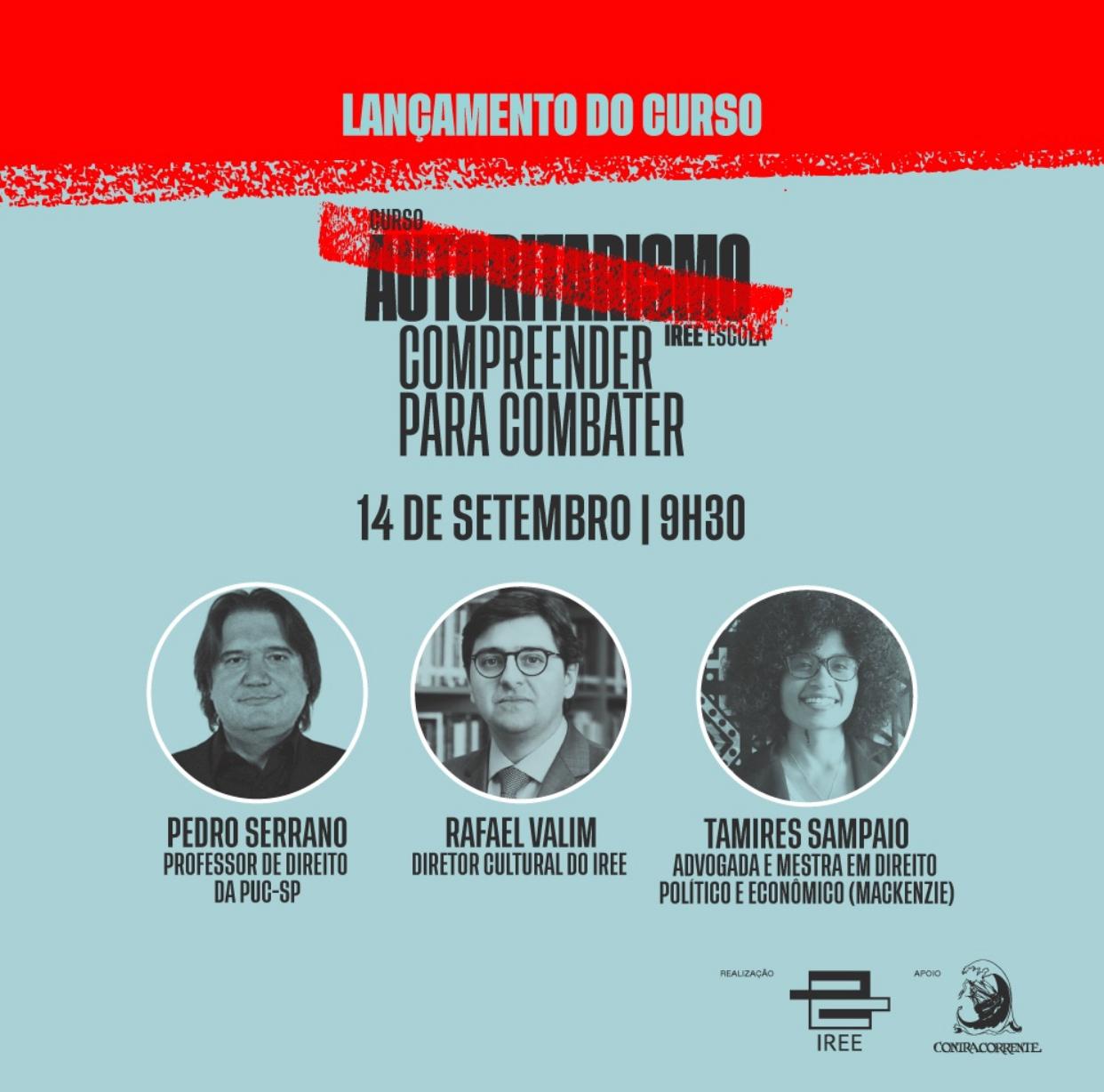 O IREE Escola lançou por meio de uma live, no último dia 14, o curso "Autoritarismo: Compreender para combater", promovido pela instituição com o apoio da Editora Contracorrente. Da webinar de lançamento participaram Pedro Serrano, professor de Direito da PUC-SP, Tamires Sampaio, advogada e mestre em Direito Político e Econômico (Mackenzie) e Rafael Valim, diretor Cultural do IREE.