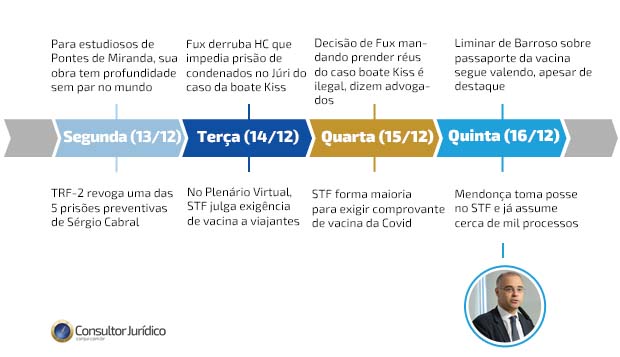 Outro tema candente da semana foi a suspensão do julgamento sobre o passaporte da vacina, que foi remarcado para fevereiro de 2022. O reagendamento ocorreu por conta de pedido de destaque do ministro Nunes Marques cerca de 6 horas antes de o julgamento ser encerrado no Plenário Virtual da corte, e depois que já havia sido formada maioria para a exigência do passaporte. O julgamento será transferido para o Plenário físico.