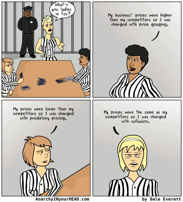 Em um mercado eficiente, preços refletem o equilíbrio entre oferta e demanda e sinalizam possíveis choques que alteram momentaneamente o equilíbrio de mercado aos consumidores e produtores. Preços também são instrumentos utilizados na competição entre concorrentes, mas nem sempre são bem compreendidos, seja por consumidores ou pelas autoridades antitruste, como mostra a tirinha acima. Estratégias competitivas via preço podem muitas vezes ser confundidas com condutas anticoncorrenciais e, por isso, uma empresa não pode ser condenada apenas pela simples observação do comportamento de seus preços.