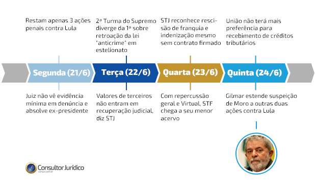 Na quinta-feira (24/6), o ministro Gilmar Mendes, do Supremo Tribunal Federal, decidiu estender a suspeição do ex-juiz Sergio Moro às ações contra o ex-presidente Luiz Inácio Lula da Silva no caso das denúncias contra ele nos casos do sítio de Atibaia e do Instituto Lula.