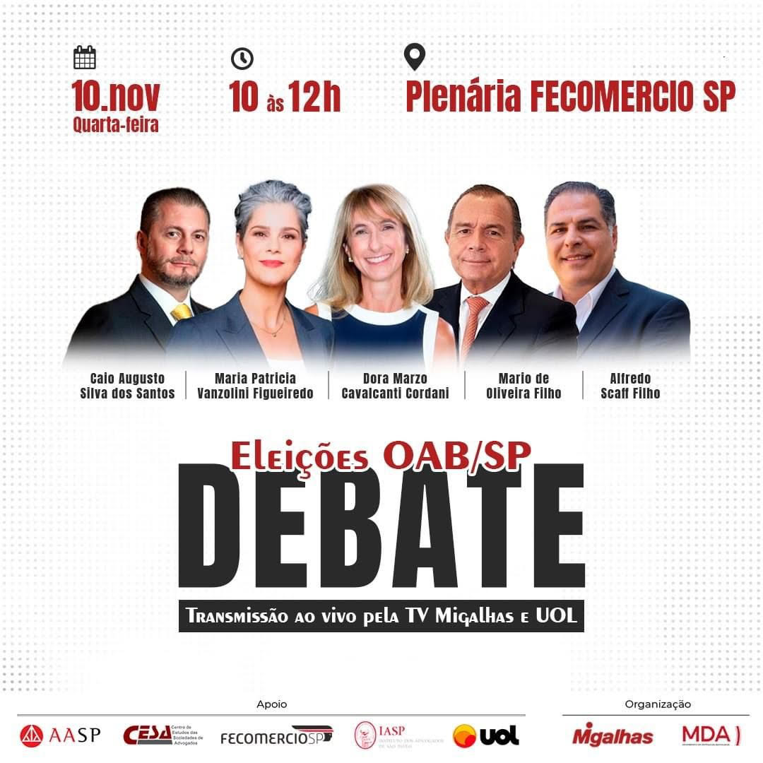 O debate é apoiado pelas entidades Aasp, Iasp e Cesa. As eleições para a nova diretoria da OAB-SP serão realizadas no dia 25 de novembro.