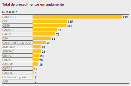 Pesquisa da advogada Selma Lemes, em 2019, cobriu oito câmaras, onde encontrou 967 processos em tramitação, com 289 julgados e volume de disputas na casa dos R$ 60 bilhões. O principal player do mercado era o Centro de Arbitragem e Mediação da Câmara de Comércio Brasil-Canadá (CAM-CCBC), com 35% do mercado.