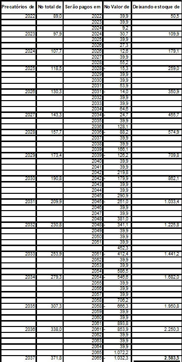 Podemos demonstrar na planilha infra o volume de pagamento que será realizado a cada ano e a evolução do estoque da dívida com sentenças judiciais definitivas e não quitadas: