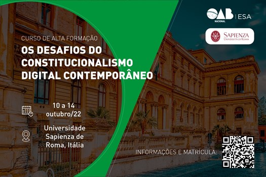 A Escola Superior de Advocacia Nacional da Ordem dos Advogados do Brasil (ESA Nacional) e a Universidade Sapienza promovem, entre os dias 10 e 14 de outubro, o curso de alta formação "Os Desafios do Constitucionalismo Digital Contemporâneo", em Roma, na Itália.