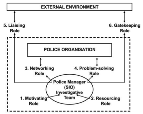 É possível indicar que o delegado de polícia, cargo equivalente ao SIO, exerce seis funções basilares na gestão da investigação criminal, divididas entre relações de ambiente interno da instituição e relação com ambiente externo. Quanto às primeiras, destacam-se as funções de líder de pessoal (garantindo função de motivação de equipe), gestor administrativo (promovendo a alocação de recursos para a execução do trabalho), porta voz (exercendo a função de rede entre a unidade policial e a instituição) e "empreendedor" (resolvendo os problemas das dinâmicas de trabalho e buscando recursos para melhoria das atividades do grupo). Acerca da relação com o ambiente externo, citam-se as funções de ligação e monitoramento (GLOMSETH; GOTTSCHALK, 2010 [11]). A primeira se relacionada às atividades de trocas de informações com ambiente externo à instituição policial, a exemplo do diálogo com a sociedade, imprensa, com a magistratura, Ministério Público ou outras forças policiais; a segunda se afigura como uma das mais significativas funções do delegado de polícia, denominada de "gatekeeper", caracterizada pela função de evitar que atividades e/ou forças externas possam prejudicar ou interferir no andamento regular das investigações, desvirtuando a atividade de Polícia Judiciária (EMIL BERG et al., 2008 [12]).