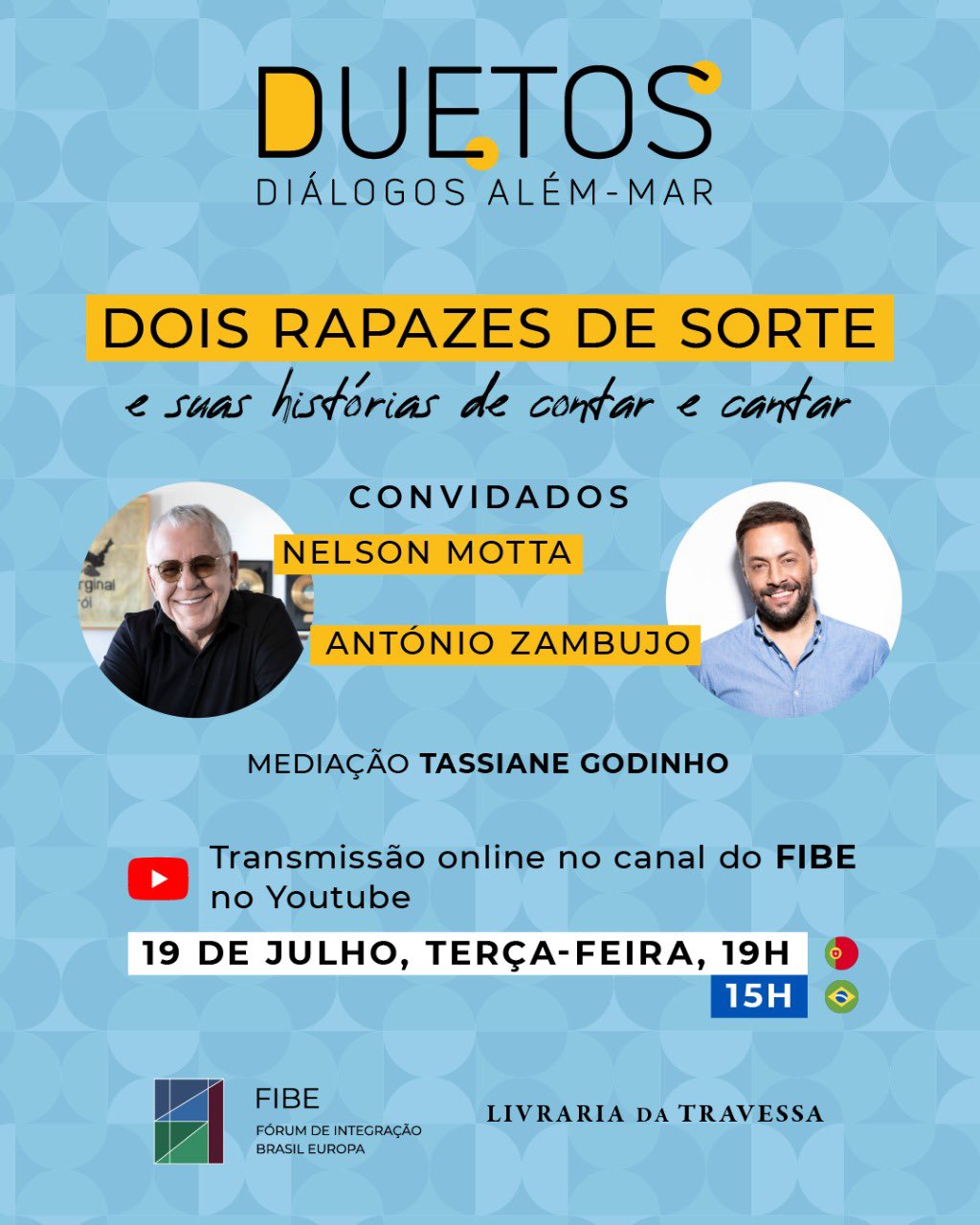 A próxima edição do "Duetos — Diálogos Além-Mar" está marcada para esta terça-feira (19/7), na Livraria da Travessa, em Lisboa, às 19h de Portugal (15h pelo horário de Brasília).