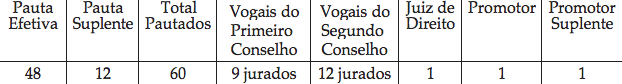 Em cada conselho de jurados eram formados dois tribunais, um, de juízes de facto, para decidir sobre a verdade dos fatos, composto por nove vogais. E um outro tribunal, de sentença, composto por 12 vogais, sempre que o primeiro tribunal desse por provados os fatos (ver Quadro III). Cada conselho era assistido por um juiz de direito que aplicava a pena de acordo com a tabela da sentença dos jurados. O promotor tinha por função pronunciar o crime ou aceitar a denúncia de particulares. Os 21 vogais dos tribunais eram sorteados de uma pauta de 48 jurados e de uma lista suplente de mais 12 jurados.