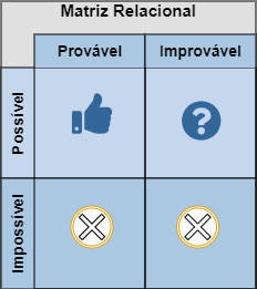 9. Distinguir entre o Possível e o Provável. A distinção entre o uso dos termos "possível" e "provável" é condição de possibilidade à operação no ambiente do RoadMapCrime. A classificação se dá em pares ordenados: (a) possível/impossível; e, (b) provável/improvável.
