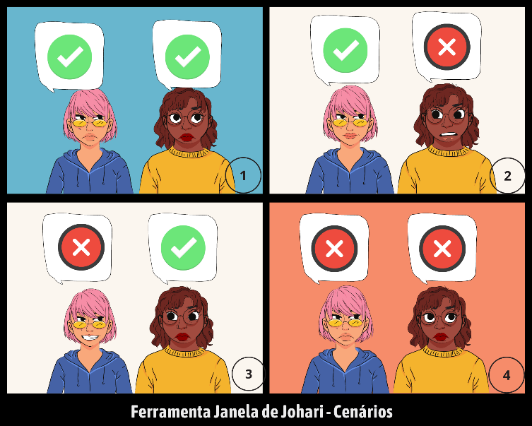 12. Imaginemos que eu e você vamos falar sobre o Tema: "Qual o melhor restaurante de massas de São Paulo"? Cada um de nós dispõe de "conhecimento" e de "informações" "privadas" (minhas e suas, em maior ou menor quantidade e qualidade). Então, utilizando a ferramenta "Janela de Johari", ao cruzarmos os pares, obteremos os seguintes Cenários: