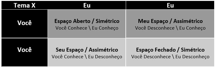 (a) Espaço Aberto (Simétrico/Conhecido): No primeiro quadrante, nós dois somos moradores da cidade e gostamos de "massa", estamos em posição de Simetria, conferindo as condições para que debatamos o Tema com maior "conhecimento" e "informação" compartilhada (qualidade e quantidade);