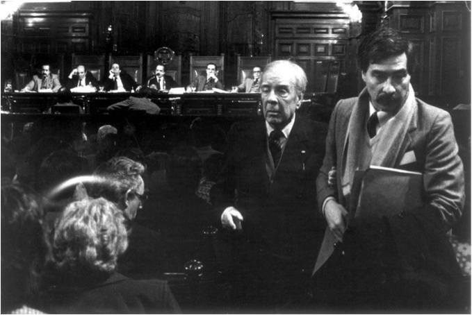 Cego, 85 anos, Jorge Luis Borges, o maior escritor argentino, decidiu ir a uma daquelas audiências judiciais, realizada cerca de um ano antes de sua morte. Antiperonista, Borges aplaudiu o golpe de Estado que derrubou Isabelita Perón. Chegou mesmo a almoçar com o general Jorge Rafael Videla em 1976, na Casa Rosada, mesmo ano em que, no Chile, foi condecorado por Augusto Pinochet. Para surpresa de muitos, em 1980, contudo, Borges assinou, ao lado do futuro presidente Raúl Alfonsín e outras personalidades, uma petição pública das Mães da Praça de Maio, com um apelo ao governo militar para que fossem publicadas as listas de desaparecidos.