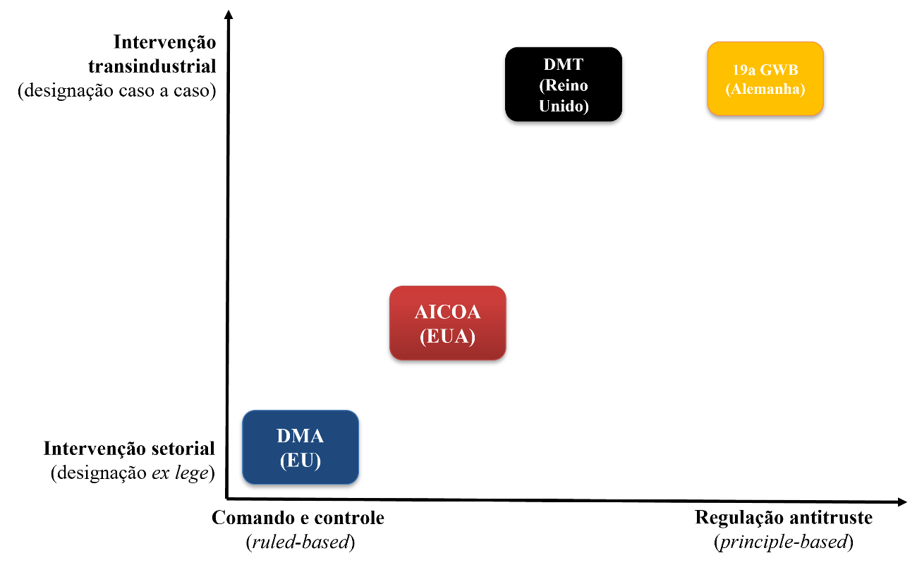 Colocando as principais propostas legislativas estrangeiras em perspectiva, é possível ver que cada proposta sopesa de forma diferente os riscos e benefícios de uma intervenção regulatória mais ou menos rígida. Mais do isso: cada uma avalia de forma única os dilemas de se afastar da lógica tradicional de intervenção antitruste. Como sistematizado na figura a seguir, suas distinções podem ser projetadas em pelo menos dois eixos, quais sejam: (i) o escopo setorial vis-à-vis traninsdustrial de intervenção e (ii) a predominância de uma estratégia de regulação baseada na lógica de comando e controle vis-à-vis um modelo de regulação de livre mercado típico da abordagem antitruste.