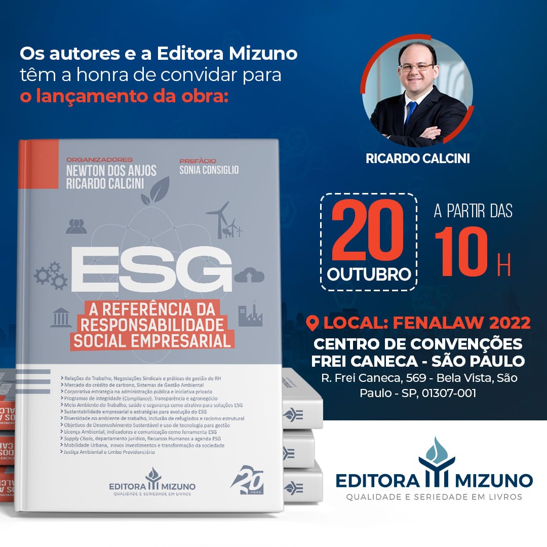 A obra "ESG: A Referência da Responsabilidade Social Empresarial" será lançada nesta quinta-feira (20/10), a partir das 10h, pela Editora Mizuno na Fenalaw 2022, evento voltado às novidades do mercado jurídico que acontece no Centro de Convenções Frei Caneca, em São Paulo.