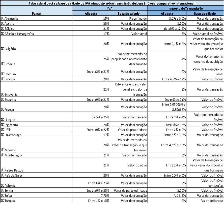 A distinção é mais visível noutros sistemas tributários, nos quais as alienações de imóveis são submetidas a duas incidências tributárias diferentes: por imposto patrimonial sobre transmissão/aquisição do bem de raiz (v.g. real estate transmission tax — rett) e por imposto sobre o consumo do imóvel (IVA). Veja-se o exemplo dos seguintes países: