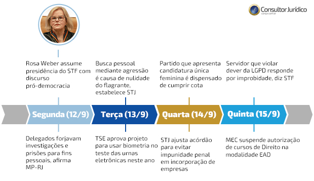 A ministra Rosa Weber assumiu na segunda-feira (12/9) a presidência do Supremo Tribunal Federal e do Conselho Nacional de Justiça. Terceira mulher a ocupar os cargos, ela ficará à frente da corte até o dia 2 de outubro de 2023, quando completará 75 anos, idade máxima para o cargo de ministro, e será aposentada compulsoriamente. Na mesma cerimônia, o ministro Luís Roberto Barroso assumiu a vice-presidência do STF.