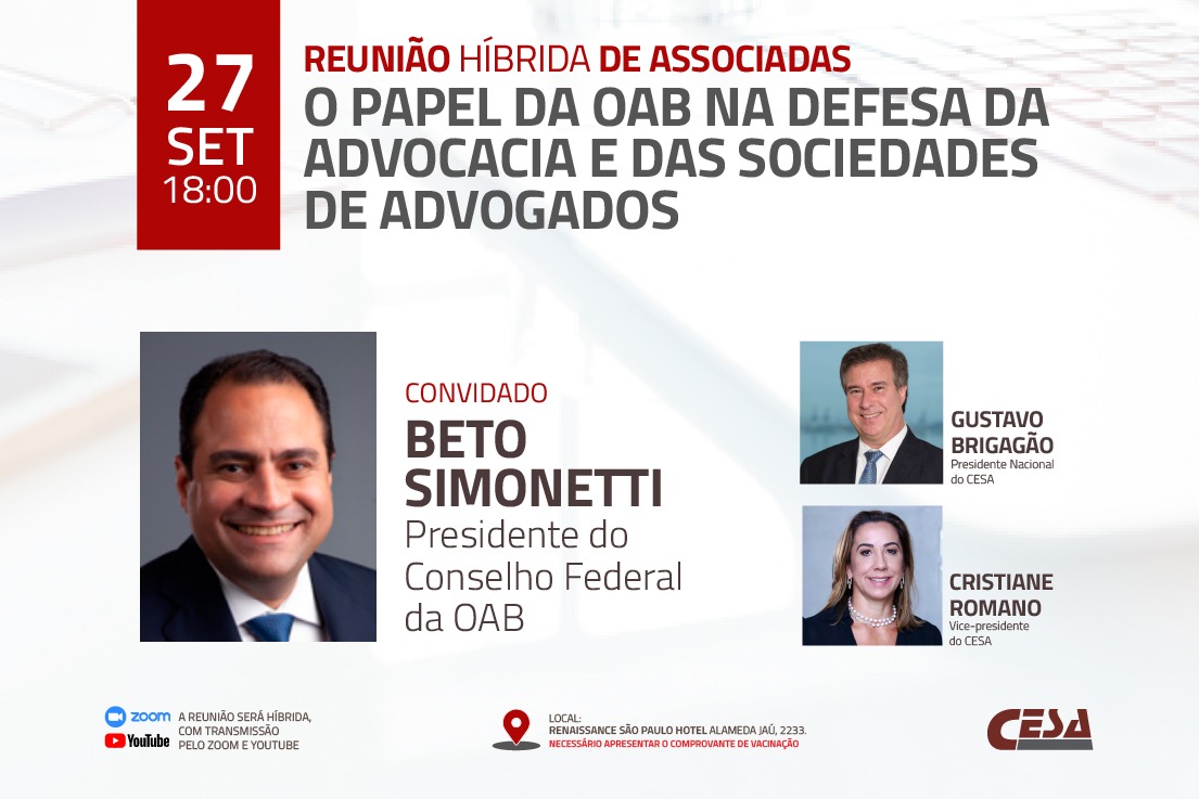O Centro de Estudos das Sociedades de Advogados (Cesa) recebe nesta terça-feira (27/9), a partir das 18h, o presidente do Conselho Federal da Ordem dos Advogados do Brasil, Beto Simonetti. O representante da entidade falará sobre "O papel da OAB na defesa da advocacia e das sociedades de advogados".