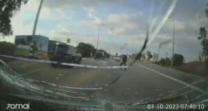 Veículo de israelense é abordado na estrada por homens do Hamas, em 7.out.2023