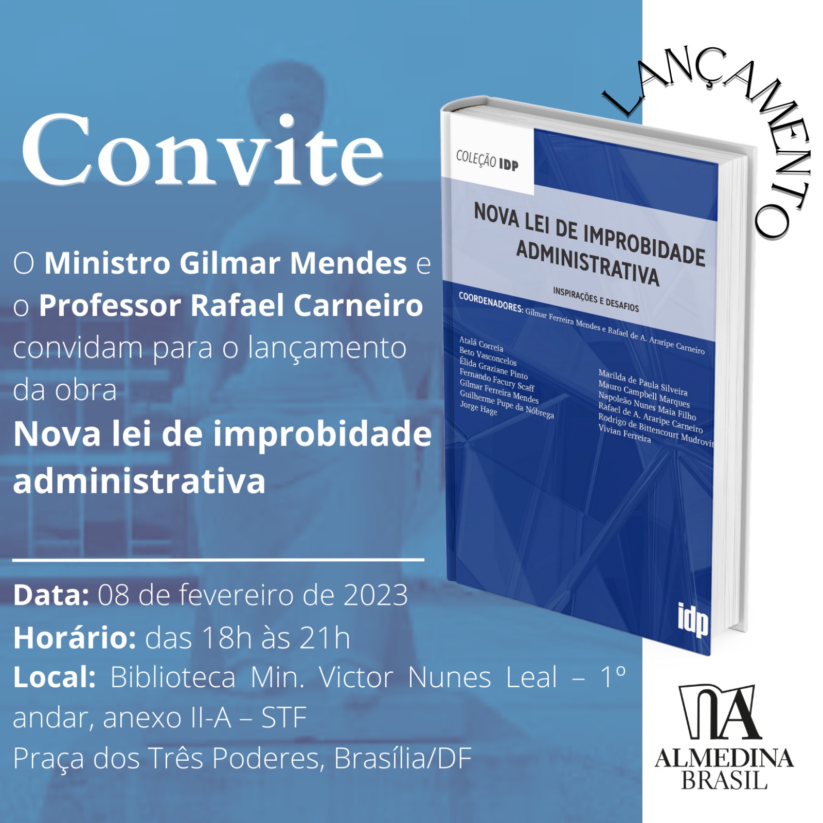 Será lançado nesta quarta-feira (8/2), em Brasília, o livro "Nova Lei de Improbidade Administrativa" (Editora Almedina), de autoria do decano do Supremo Tribunal Federal, ministro Gilmar Mendes, e do advogado e professor do IDP Rafael Carneiro.