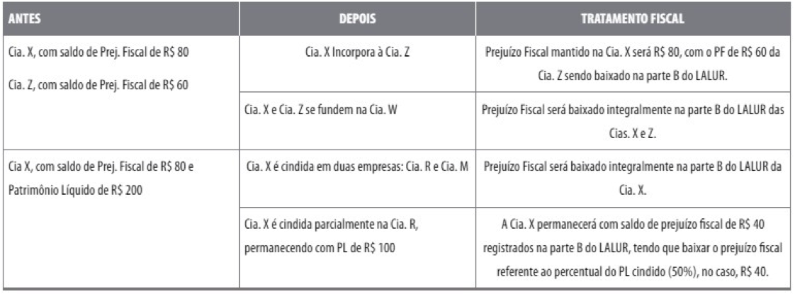Em outras palavras, se a sociedade for extinta, ela perderá os prejuízos fiscais e, no caso de cisão parcial, o prejuízo fiscal será proporcional. Com isso, a sociedade que for fusionada, cindida totalmente ou incorporada perderá o prejuízo fiscal, pois o Fisco entende que haverá uma nova empresa (PÊGAS, 2017).