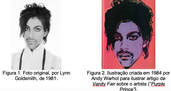 Anos depois, Goldsmith autorizou, por meio de uma licença limitada para uso específico, que a revista Vanity Fair utilizasse uma de suas fotografias de Prince (figura 1) para criar uma ilustração artística e utilizá-la em um artigo jornalístico sobre cantor. Com os devidos créditos atribuídos à fotografa, tal ilustração foi então criada pelo artista Andy Warhol (Purple Prince — figura 2) e publicada por Vanity Fair em 1984.