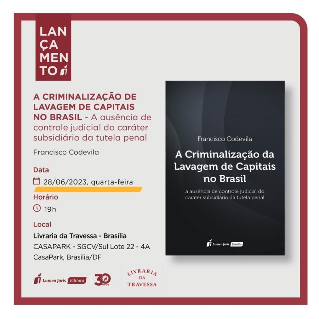 "A criminalização da lavagem de capitais no Brasil" é o título do livro que o advogado Francisco Codevila lança nesta quarta-feira (28/6), a partir das 19h, na Livraria da Travessa em Brasília.