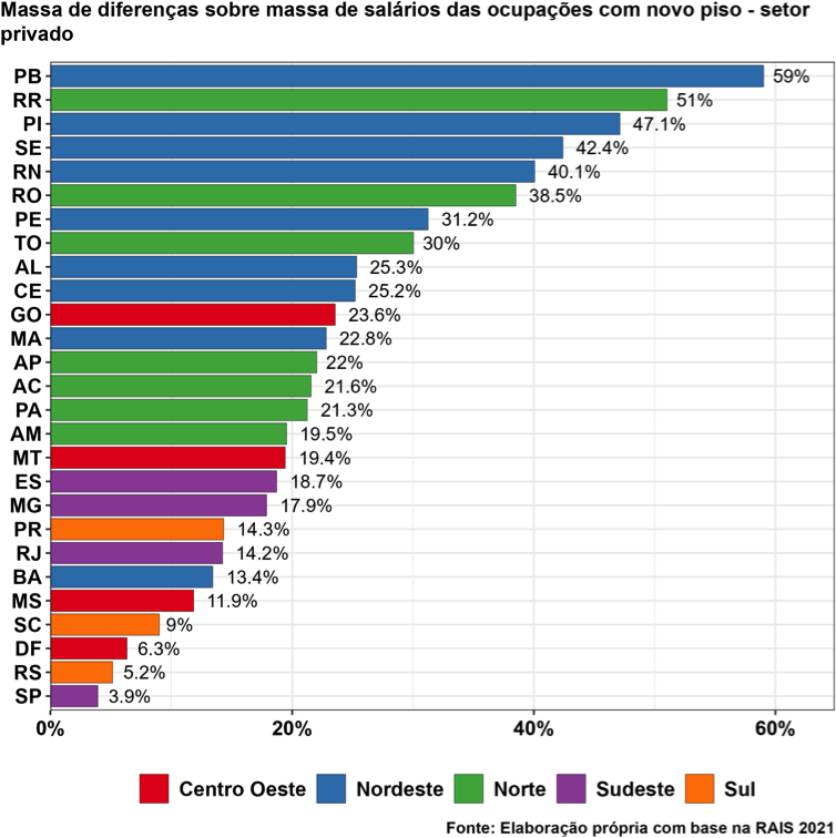 A tabela a seguir ilustra o montante de novos recursos que cada unidade federativa precisará alocar para manter seus trabalhadores empregados e para cumprir os valores do piso salarial. Para exemplificar o caso mais crítico, a Paraíba, no setor privado e nas ocupações de interesse, terá que mobilizar um valor adicional de 59% além dos pagamentos de salários atuais.