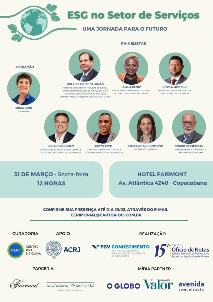 Entre os palestrantes estão Luis Felipe Salomão, ministro do Superior Tribunal de Justiça e corregedor nacional de Justiça; Nicola Miccione, chefe da Casa Civil do estado do Rio de Janeiro; Eduardo Gussem, ex-procurador-geral da Justiça e especialista em compliance; e o economista Sérgio Besserman, do Centro Brasil no Clima.