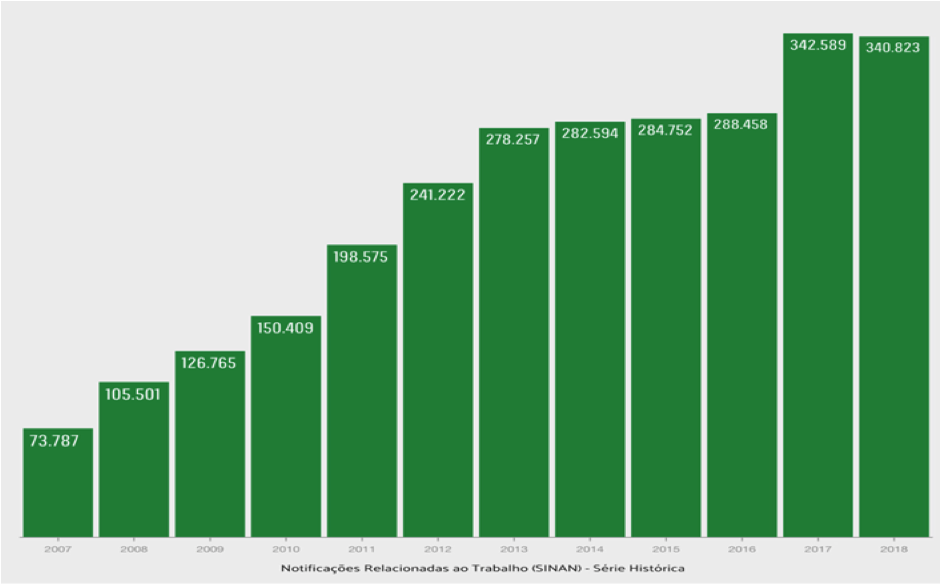 Os dados precisam ser atualizados, mas ainda servem como padrão de observação do que se pretende mostrar aqui. Conforme o Anuário Estatístico da Previdência Social, lançado em janeiro de 2015 e referente a 2013, o ano em que foram registrados 717.911 acidentes de trabalho no Brasil [6]. As ocorrências resultaram em 2.792 mortes, equivalendo que, a cada dia, mais de sete trabalhadores brasileiros perderam a vida executando sua atividade profissional [7]. De 2007 a 2018, em uma versão, na qual, somente foram consideradas as doenças e agravos monitorados com ênfase pela Vigilância em Saúde do Trabalhador do Ministério da Saúde, foram 2.713.732 notificações. O total inclui os seguintes casos: acidente de trabalho grave, câncer relacionado ao trabalho, dermatoses ocupacionais, acidente de trabalho com exposição a material biológico, intoxicação exógena relacionada ao trabalho, LER/Dort, Perda Auditiva Induzida por Ruído (Pair) relacionada ao trabalho, pneumoconioses relacionadas ao trabalho, transtornos mentais relacionados ao trabalho e acidente de trabalho grave envolvendo crianças e adolescentes (0 a 17 anos). No gráfico a seguir, demonstra-se a evolução da série histórica [8]: