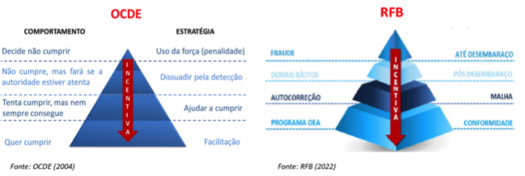 Enquanto a OCDE traz, na base da pirâmide, como principal foco o comportamento de "conformidade" por parte do importador e, como resposta, propõe uma postura de facilitação por parte da fiscalização, a RFB, em sua versão, traz como foco o Programa OEA, sendo esta a única possibilidade para que o importador seja classificado verdadeiramente como "conforme".
