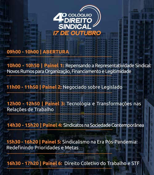 O 4º Colóquio de Direito Sindical do Sindicato das Sociedades de Advogados dos Estados de São Paulo e Rio de Janeiro (Sinsa) reunirá especialistas, em 17 de outubro, para discutir aspectos relevantes do Direito Sindical e do Direito do Trabalho.