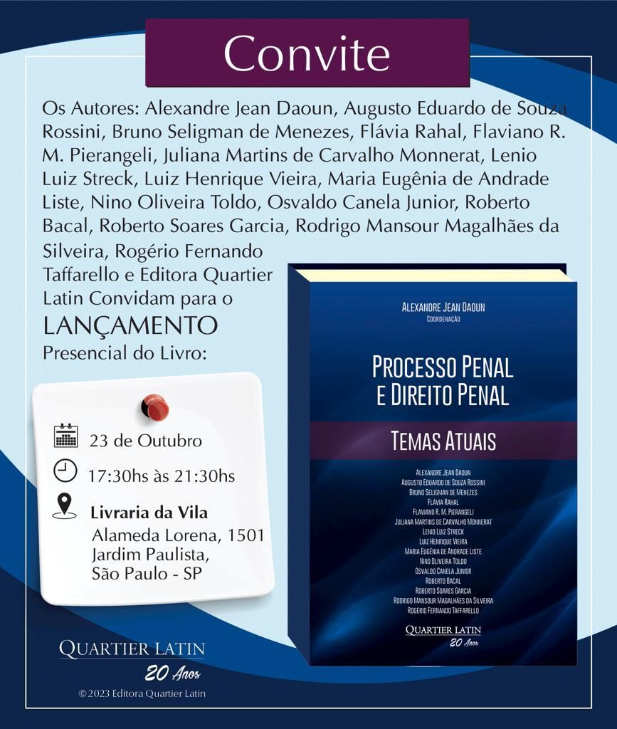 A obra coletiva "Processo Penal e Direito Penal — Temas Atuais", publicada pela editora Quartier Latin, será lançada nesta segunda-feira (23/10), às 17h30, na loja da Livraria da Vila localizada na Alameda Lorena, em São Paulo.