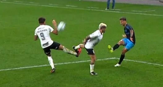 — Aos 49 minutos da segunda etapa, o atleta número 9 da equipe de branco e preto, em ação de bloqueio, com o braço em posição antinatural e aumentando seu espaço corporal, intercepta um cruzamento à área. O bloqueio da bola com o braço nessa ação caracteriza a infração de pênalti, portanto uma penalidade deveria ser marcada no campo de jogo. E quando não marcada, o VAR deveria recomendar revisão para tal ação.