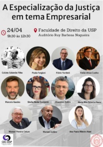 A Faculdade de Direito da Universidade de São Paulo (FDUSP) vai promover na próxima quarta-feira (24/4) o evento “A especialização da Justiça em tema empresarial”, sobre a importância das varas e câmaras empresariais. Os debates ocorrerão entre 9h30 e 12h30, no Auditório Ruy Barbosa Nogueira.