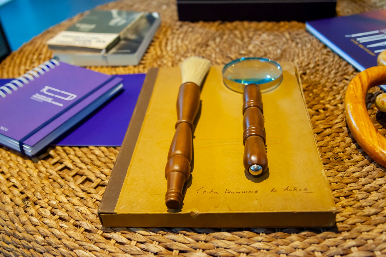 A mesinha de centro abriga obras assinadas de punho próprio pelo poeta e uma raridade: uma edição de Amor, Amores, livro de poemas eróticos de Drummond de Andrade, ilustrado por Carlos Leão, junto com o artístico convite para o lançamento.