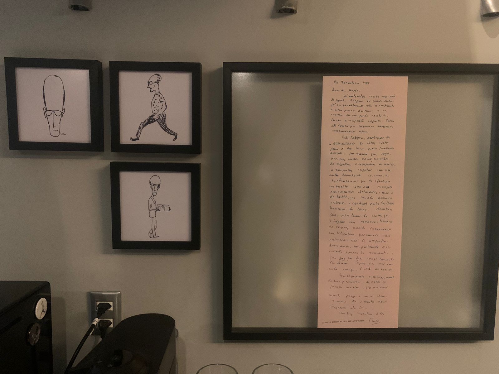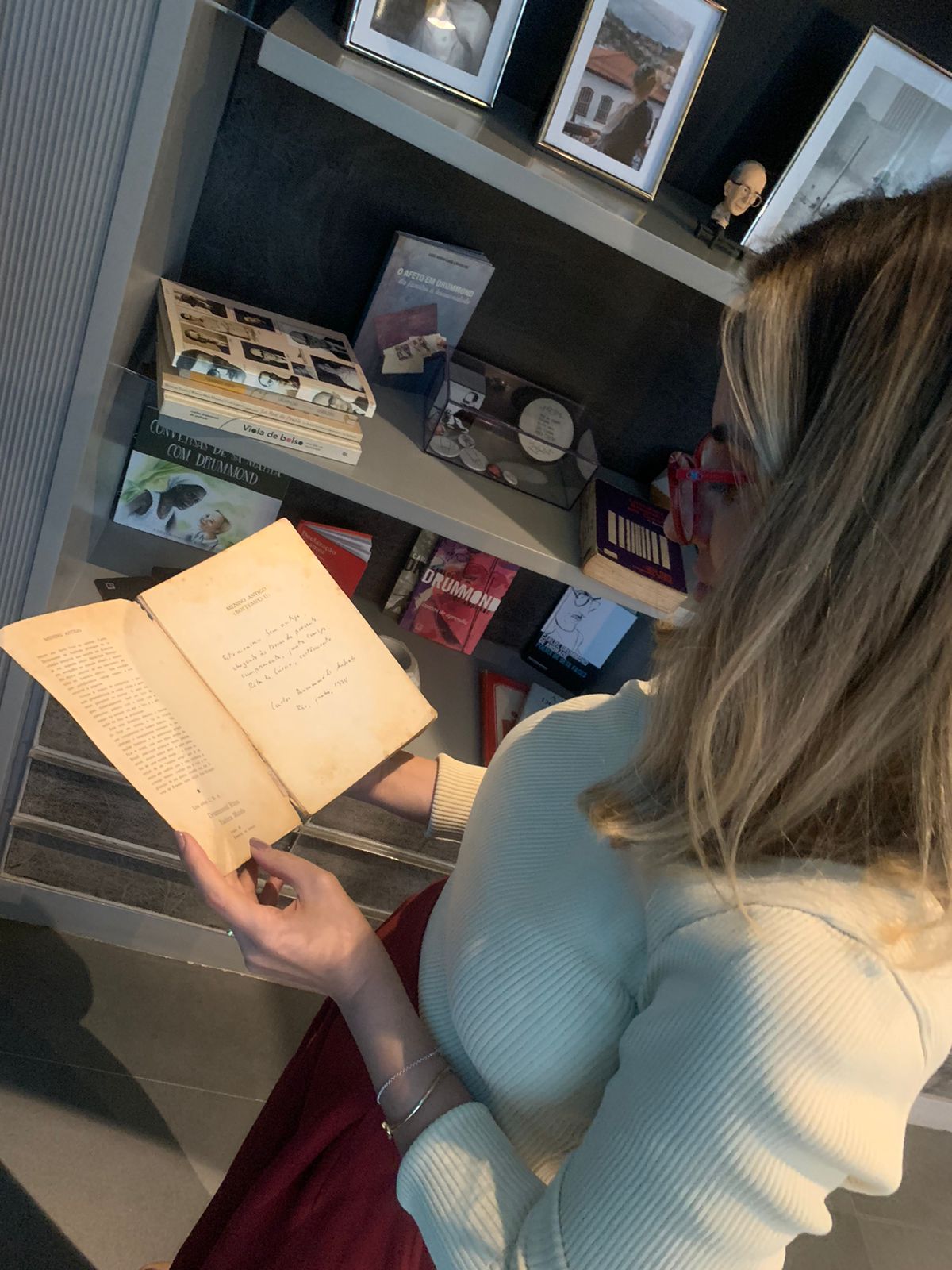 “Quando chegamos, essa separação, onde agora fica o memorial, já existia. Nós contamos para a arquiteta do nosso desejo de fazer um espaço dedicado ao Drummond e ela disse: ‘Vai ser aqui’”, conta a advogada. Desde então, ela passou a reunir itens da família.
