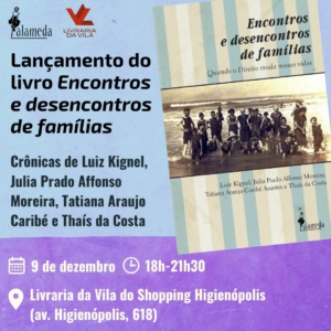 O livro Encontros e desencontros de famílias: quando o Direito muda nossas vidas (Editora Alameda), de Luiz Kignel, Julia Prado Affonso Moreira, Tatiana Araújo Caribé Arantes e Thaís da Costa, do PLKC Advogados, será lançado na próxima segunda-feira (9/12) em São Paulo. O evento ocorrerá das 18h às 21h30 na Livraria da Vila do Shopping Higienópolis, que fica na Avenida Higienópolis, 618.