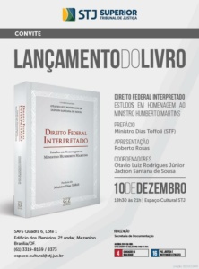 O livro Direito Federal interpretado: estudos em homenagem ao ministro Humberto Martins (GZ) será lançado nesta terça-feira (10/12) no Espaço Cultural do Superior Tribunal de Justiça, em Brasília, das 18h30 às 21h.