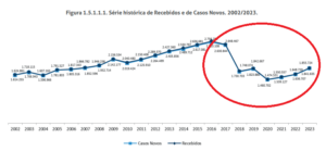 Dentre os dados relacionados à litigiosidade, seguramente um dos mais importantes corresponde ao volume de ações ajuizadas. Observando o gráfico quanto ao período de 2017 a 2023, constata-se uma linha descendente de maior inclinação (2017 a 2020), seguida por uma linha ascendente de menor inclinação (de 2021 a 2023), conforme a imagem a seguir [1].