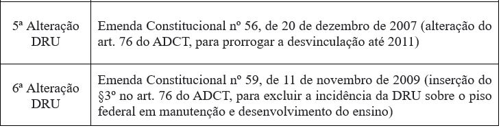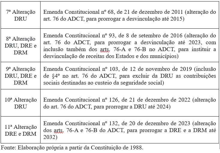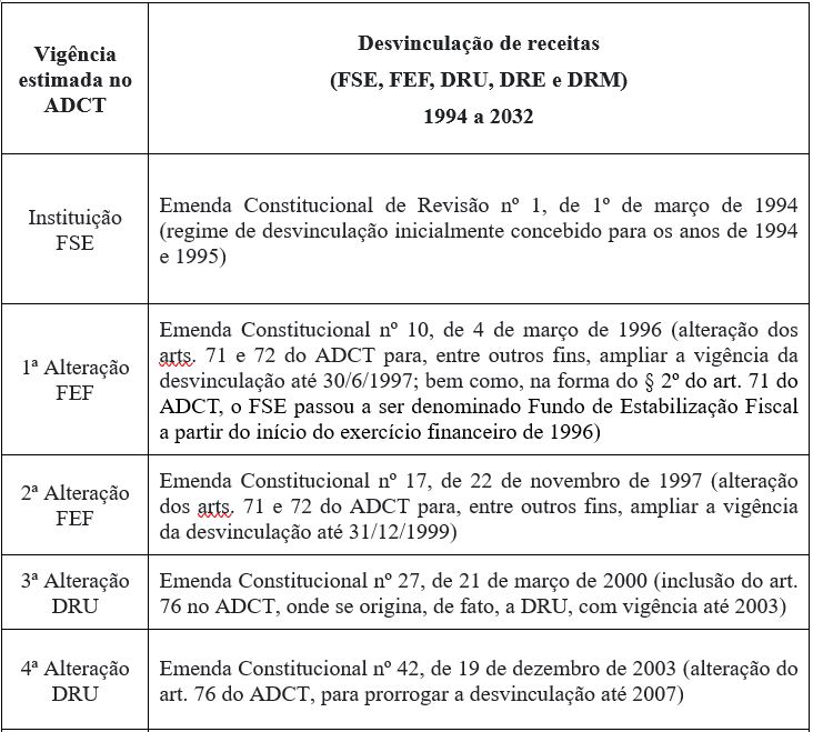 Desde sua instituição até os presentes dias, foram 12 Emendas Constitucionais, que cuidaram — direta ou indiretamente — da desvinculação de receitas, prevendo-a, redesignando-a, ampliando-a e, sobretudo, prorrogando-a no ADCT. A tabela abaixo contempla os respectivos dados basilares: