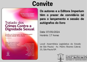 Será lançado nesta terça-feira (7/5), às 17h, na Assembleia Legislativa do Estado de São Paulo (Alesp), o livro Tratado dos Crimes Contra a Dignidade Sexual. A obra foi organizada pelo advogado criminalista Henrique Augusto Freire Teotônio, pelo juiz substituto em segundo grau Luís Augusto Freire Teotônio e pelo promotor de Justiça Paulo José Freire Teotônio.