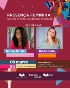 A seccional de São Paulo da Ordem dos Advogados do Brasil (OAB-SP) promoverá nesta sexta-feira (8/3), Dia Internacional da Mulher, o evento “Presença Feminina: Corpos e Vozes Ocupando o Espaço”, com cobrança de ingressos (preços a partir de R$ 10).