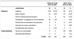 Diante desse cenário, em estudo recente publicado no Benefit-Cost Analysis Journal, intitulado “Open Exceptions: Why Does the Brazilian Health Regulatory Agency (ANVISA) Exempts RIA and Ex Post Reviews?”, realizamos uma nova coleta de dados para obter informações sobre as RDCs e INs aprovadas pela Anvisa após a data de vigência do Regulamento da AIR (15 de abril de 2021), assim como sobre as razões apresentadas para embasar as hipóteses de dispensa.