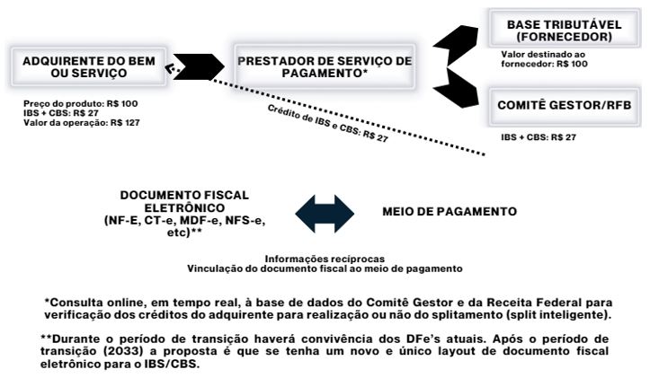 Tudo isso através de uma comunicação integrada entre o documento fiscal eletrônico e o meio de pagamento, com informações e vinculações recíprocas. Neste processo, haverá uma consulta em tempo real à administração tributária para verificação dos créditos que o contribuinte possui junto ao Fisco. Assim, o Comitê Gestor e a Receita Federal informarão à instituição de pagamento a situação do adquirente. Não havendo créditos a apropriar, o valor integral do tributo será objeto do split payment e retido pela instituição financeira.