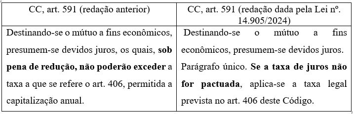 Se não houve alteração na primeira parte do caput do artigo 406 do Código Civil, por outro lado a Lei nº 14.905/2024 alterou o artigo 591 do Código Civil, cuja redação anterior dispunha que, no mútuo feneratício, os juros “não poderão exceder a taxa a que se refere o artigo 406”, estabelecendo um limite expresso à taxa de juros que, na nova redação, foi excluído, tendo o legislador optado pela incidência da taxa legal prevista no artigo 406 apenas “se a taxa de juros não for pactuada”. Veja-se o comparativo: