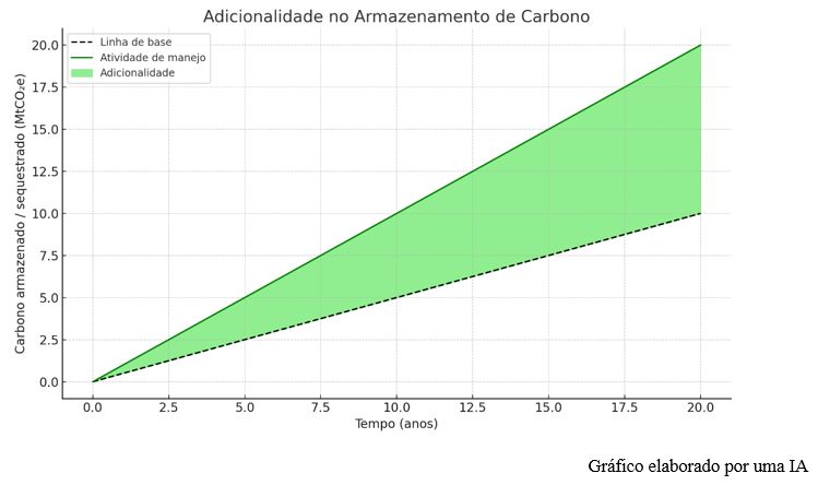 A área verde clara representa a adicionalidade propriamente dita, a diferença positiva entre a baseline e o que foi sequestrado. É essa a área que deve ser contabilizada como credito de carbono, pois é ela que demonstra a integridade ambiental do projeto, sem ela não haveria crédito legitimo a ser emitido.